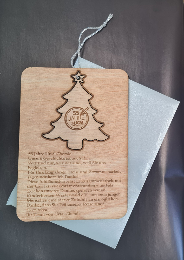 Ein Highlight der Karte ist der kleine Tannenbaumanhänger, der zusammen mit einem passenden Bändchen geliefert wird. Wir hoffen, dass er bei allen Empfängerinnen und Empfängern einen schönen Platz findet – als kleine Erinnerung an das Jubiläumsjahr und an die Menschen hinter Ursa-Chemie.