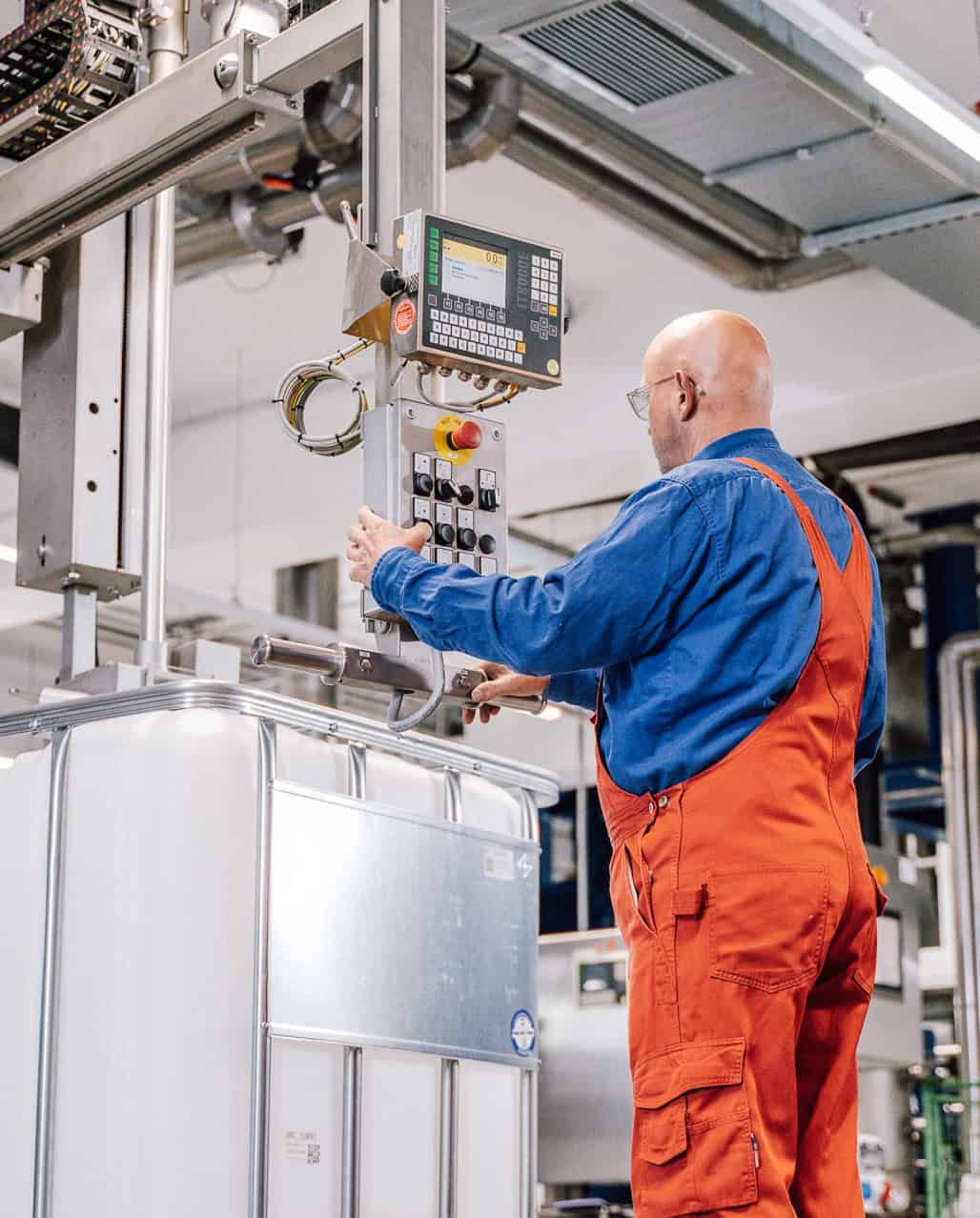 We manage and monitor all chemical manufacturing steps in a specially developed, protected process control system (PCS), which is connected to our systems. Before going into production, the raw materials to be used are scanned and the batch data recorded. The chemicals to be used are then compared with the raw materials provided. Environmentally friendly and safe storage of chemicals is a matter of course for us, while we also recognise the importance of energy in our manufacturing processes.