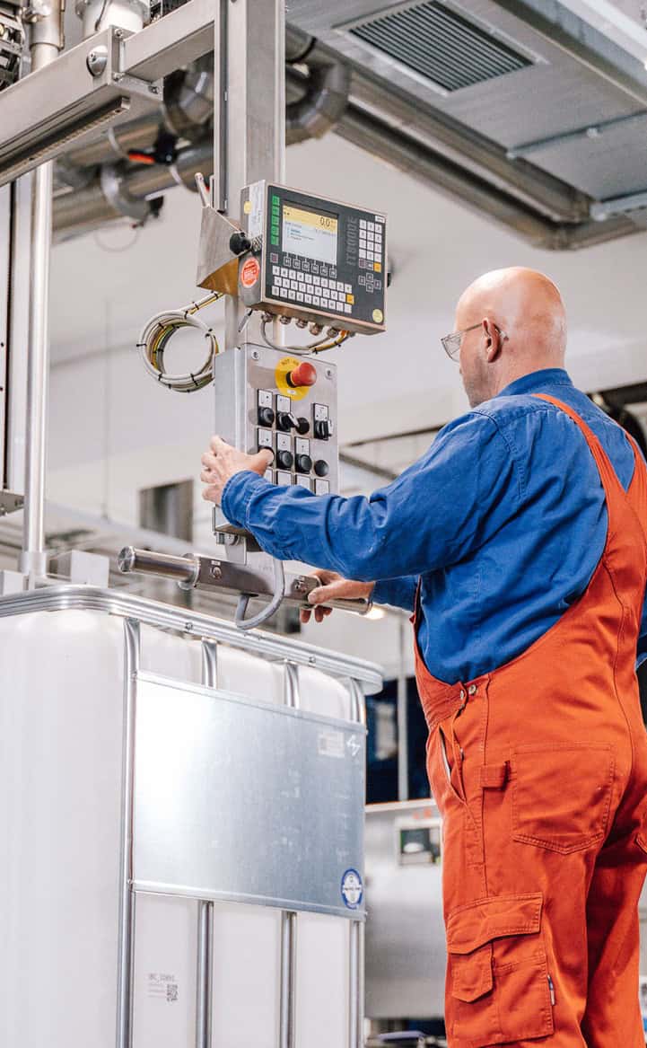 The stainless steel stirrer tanks have a capacity of up to 10,000 litres. Special stirrers enable the creation of chemicals with a viscosity of up to 30,000 mPas, while powerful dispersants allow the creation of stable oil-in-water emulsions. In addition, low-viscosity chemicals with a high foaming capacity can be formulated foam-free using a jet stream mixer.